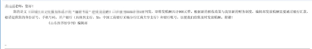 我的点评:这是国内目前不可多见的良心期刊。首先审稿速度很快,15天见分晓,不耽误时间,如果被选上会签署发表协议,一般在4-6个月见知网,同时收到两本样刊;其次没有乌烟瘴气的版面费审稿费等,还有令人惊喜的稿费;再次不以身份论质量,许多文章作者都是本科或普通馆员,也没有什么基金挂靠;最后期刊编辑非常认真负责,消解文章中的小语病,力保文章编校质量。全过程都是编辑部在操作,只需静候佳音。必须好评!