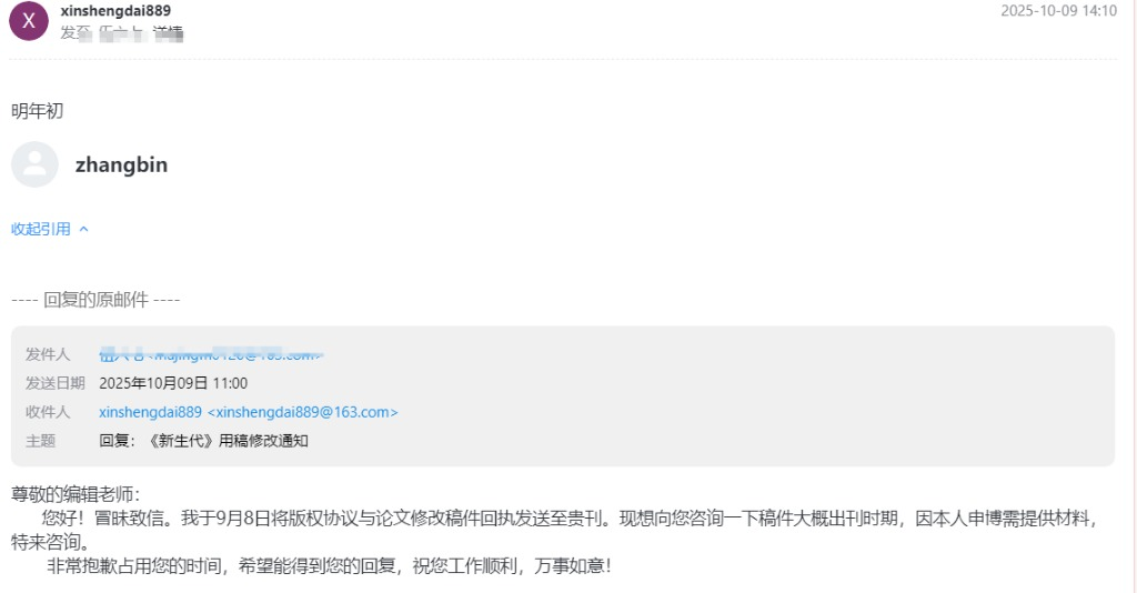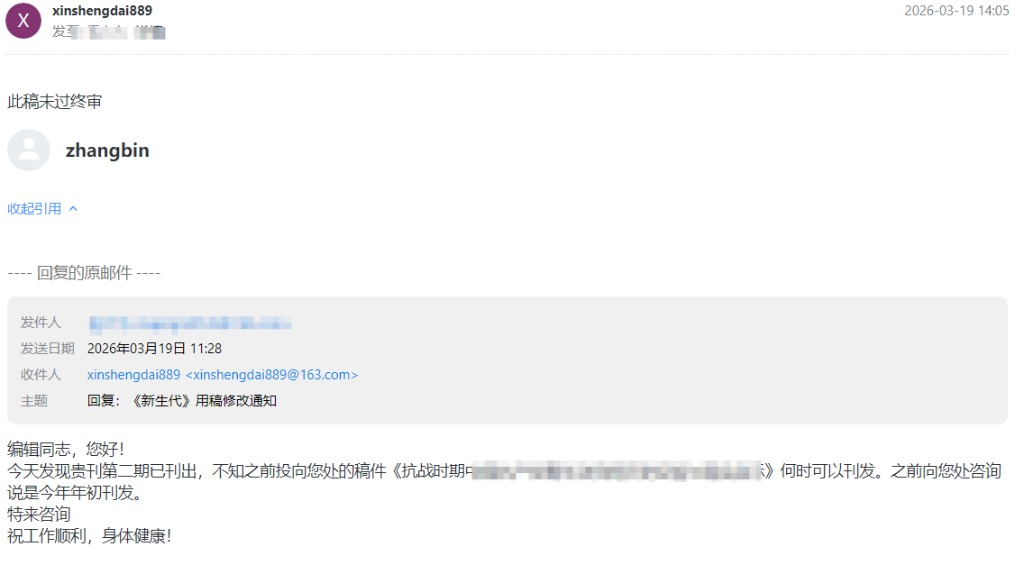 3月17日,邮箱收到拒稿信。内容如下:“您好。大作收到,经审阅不宜我刊采用,囿于编辑力量所限,无法给您提供具体建议,请原谅。谢谢您对本刊的信任和支持。《史学月刊》编辑部”