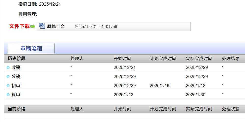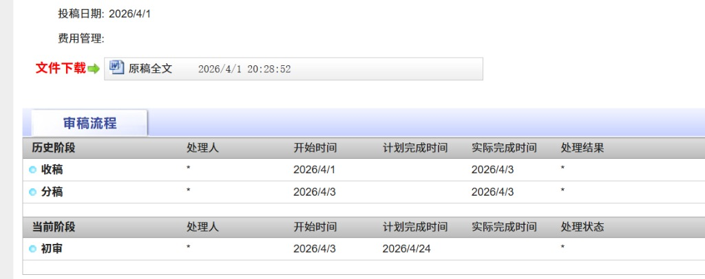 我的点评:投稿后不久进入收稿阶段,收稿完成后,进入初审,和往常一样,初审过后上面提示有预计处理时间,预计处理时间到后自动退稿。不过,这个系统的投稿是有编辑在看的。这个给编辑工作人员人员,再打磨一下稿件,提升文章质量。