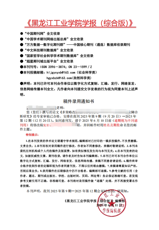 我的点评:5.26投稿,5.30号也就是端午节前一天收到初审合格通知书,从读取邮件到收到初审合格通知书只隔了一个小时。6.11收到录用通知书,这个期刊是非常快的。预计发表在25年第九期到12其之间。第二次被这个期刊录用了,免费且速度快,要求不高,好评拉满