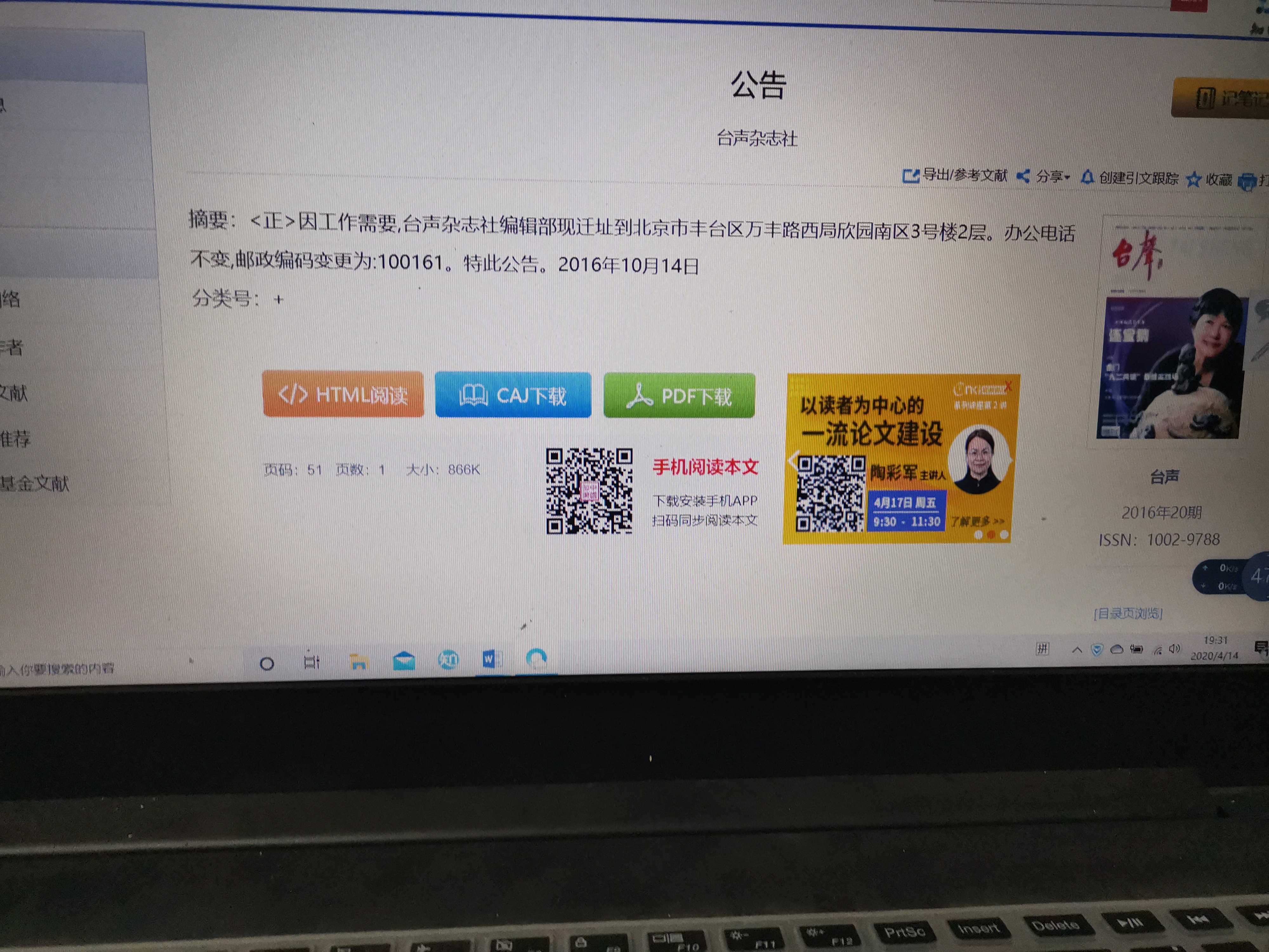 管理员回复:您好!由于您提供的是2016年的信息,我们以刊内信息为准,现在刊内公布的地址只有社址北京东城区朝内大街188号台声杂志社!