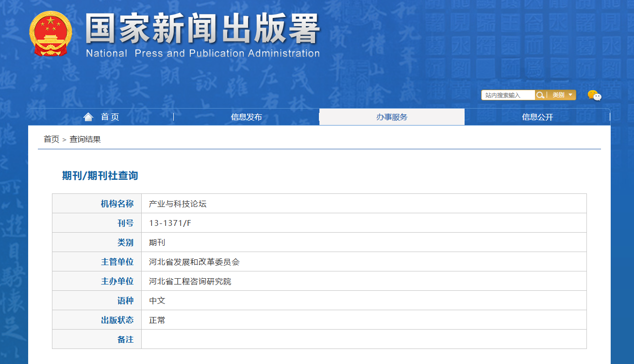 《产业与科技论坛》杂志(中国标准连续性出版物号:ISSN 1673-5641 CN 13-1371/F 邮发代号:18-181)是国家新闻出版总署批准,河北省科学技术协会主办主管,被中国知网CNKI《中国学术期刊网络出版总库》和万方—数字化期刊群《中国核心期刊(遴选)数据库》全文收录的省级全国综合性理论与实践半月刊,为国家新闻出版广电总局第一批认定的学术期刊;中国期刊全文数据库全文收录期刊;中国学术期刊(光盘版)全文收录期刊;中国学术期刊综合评价数据库统计源期刊;中国核心期刊(遴选)数据库全文收录期刊。本刊所发表论文可作为职称评定、论文答辩、课题结项、综合考核等有效材料。