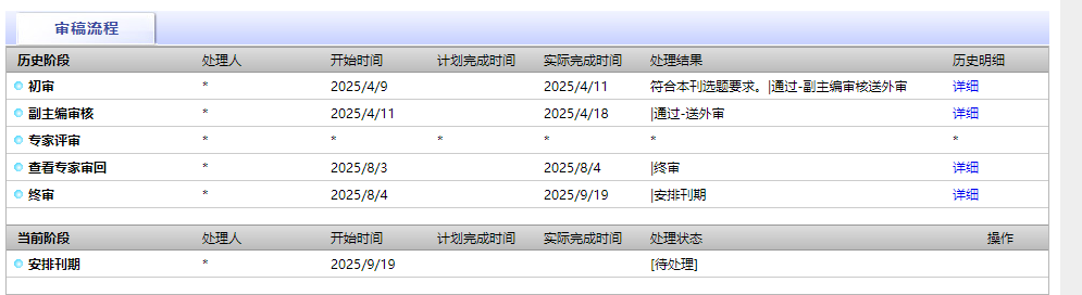 我的点评:8月20日系统投稿,11月14日安排刊期录用,各个阶段时间紧凑,不拖延,良心好刊。可能出刊比较慢,因为是季刊。