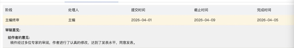 我的点评:审稿周期相对较快,每个时间节点都很准时。编辑老师态度非常好。最后一次外审回来后,我修回慢了,提交修改稿的前一天刚刚开过编委会,所以终审等了2个月。只要认真按照修改意见尽最大可能修改,就有希望。