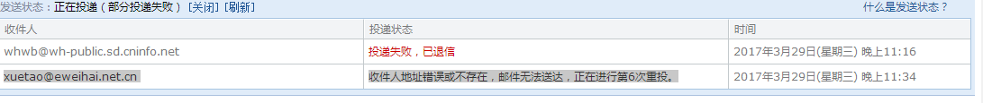 1、收件人邮件地址(whwb@wh-public.sd.cninfo.net)不存在,邮件无法送达。