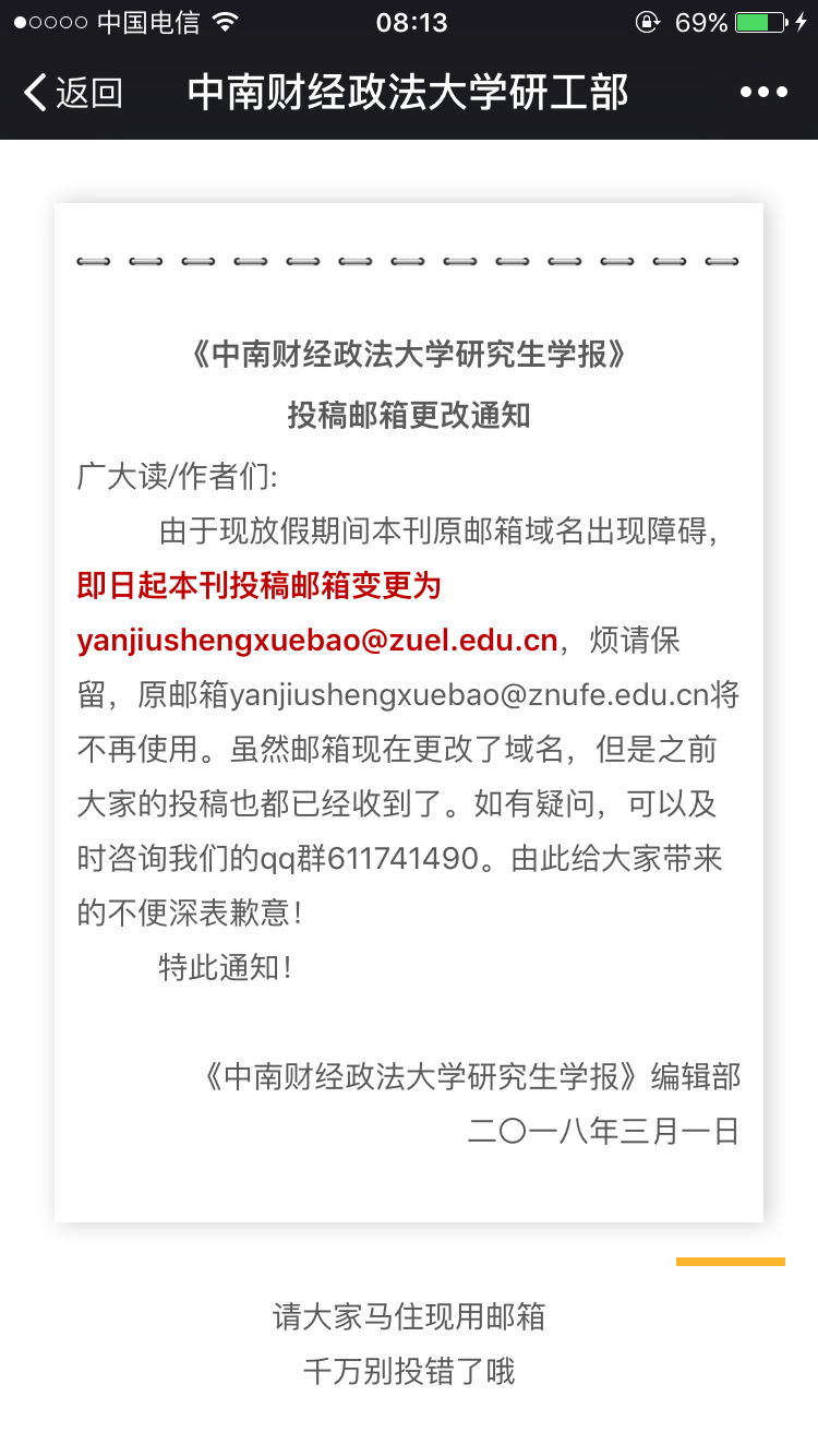 我校研究生学报的投稿邮箱已经更改为yanjiushengxuebao@zuel.edu.cn