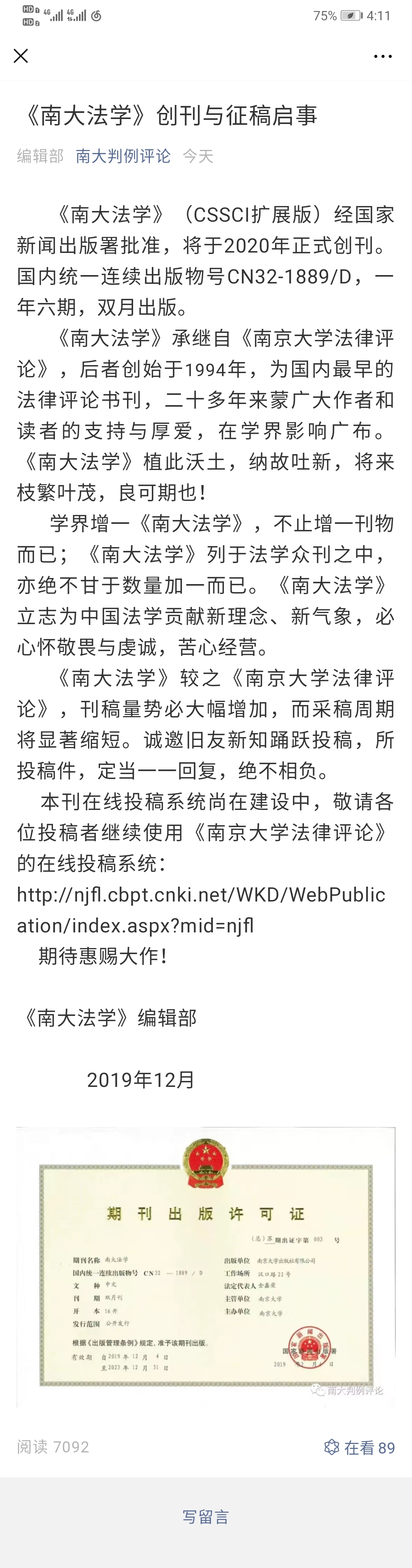 南京大学法律评论改为南大法学了,将于2020年正式创刊。国内统一连续出版物号CN32-1889/D,一年6期,双月出版。