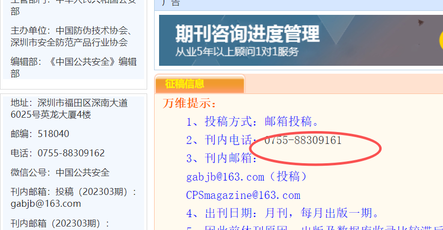 《中国公共安全》收录的信息页面,投稿电话有一处不对。应为0755-88309162. 页面上显示的0755-88309161是错的,需删除0755-88309161.