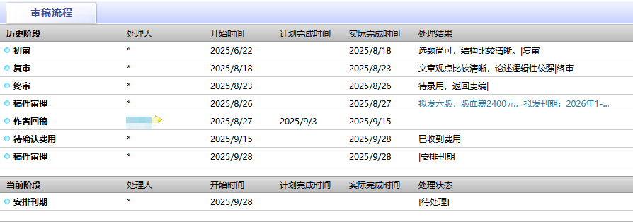 我的点评:之前投过两次都是初审退稿,这次从初审到录用正好一个月,审稿速度较快,流程清晰。该刊可发硕士独作,感觉如果与栏目的收稿选题相符录用机率会比较大,想尝试的学友可以关注一下25年上半年重点选题。