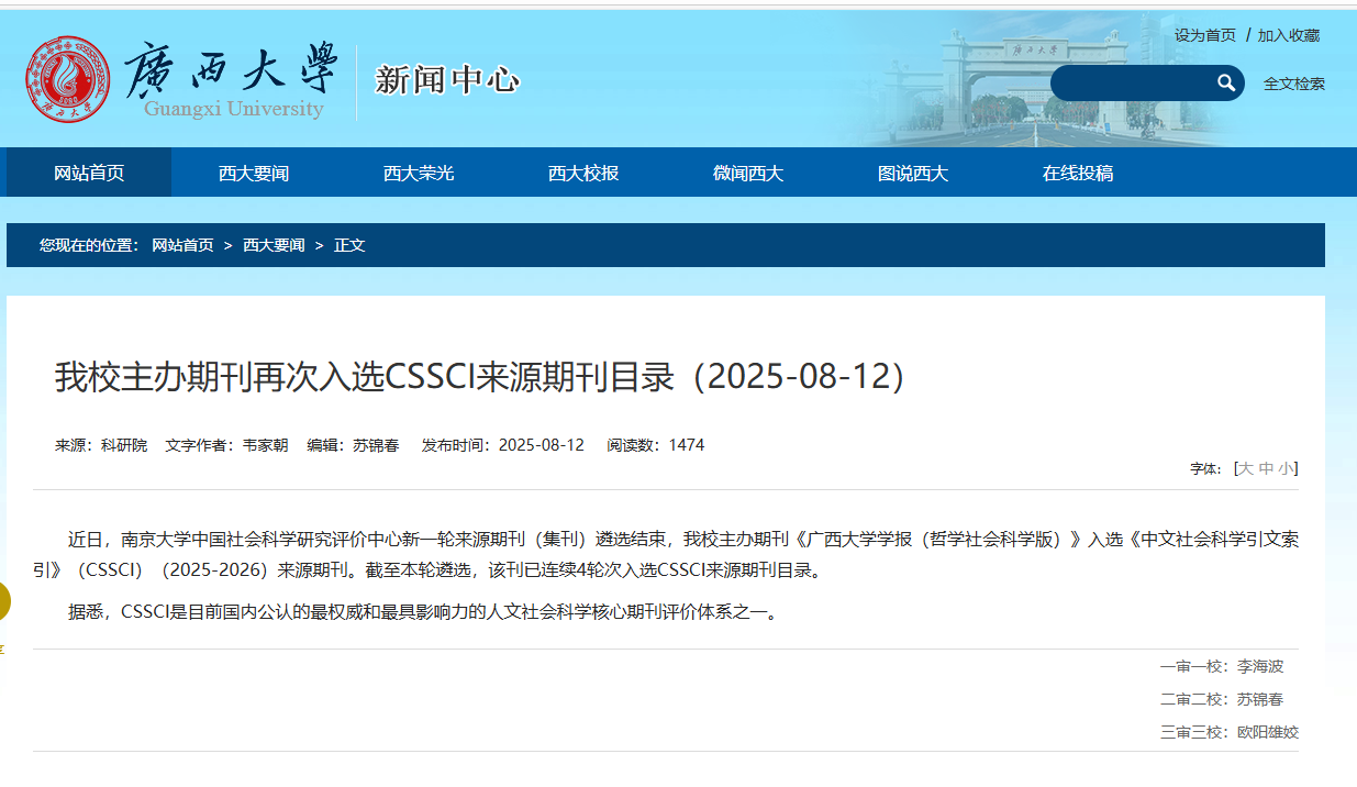 我的点评:广西大学学报社会科学版,根据官网的文章,已入选CSSCI来源期刊(2025-2026)。不过官网并未公布入选证书。