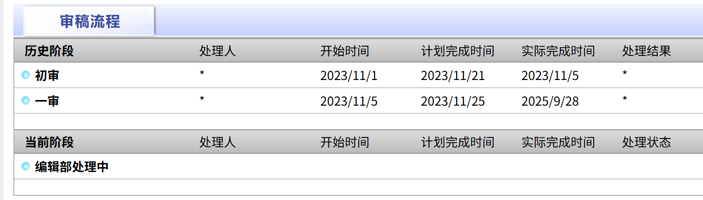 该刊初审应该是分稿,一审为初审,据学友反馈超期似乎意味着退稿,系统上要过段时间才处理。