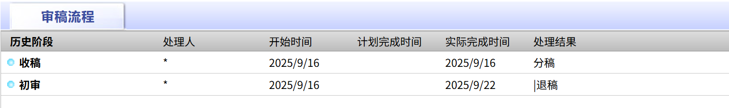 我的点评:系统投稿,有自动回复,第二天分稿初审,隔了清明假期,到了第七天直接退稿,无邮件通知,速度飞快,好评。
