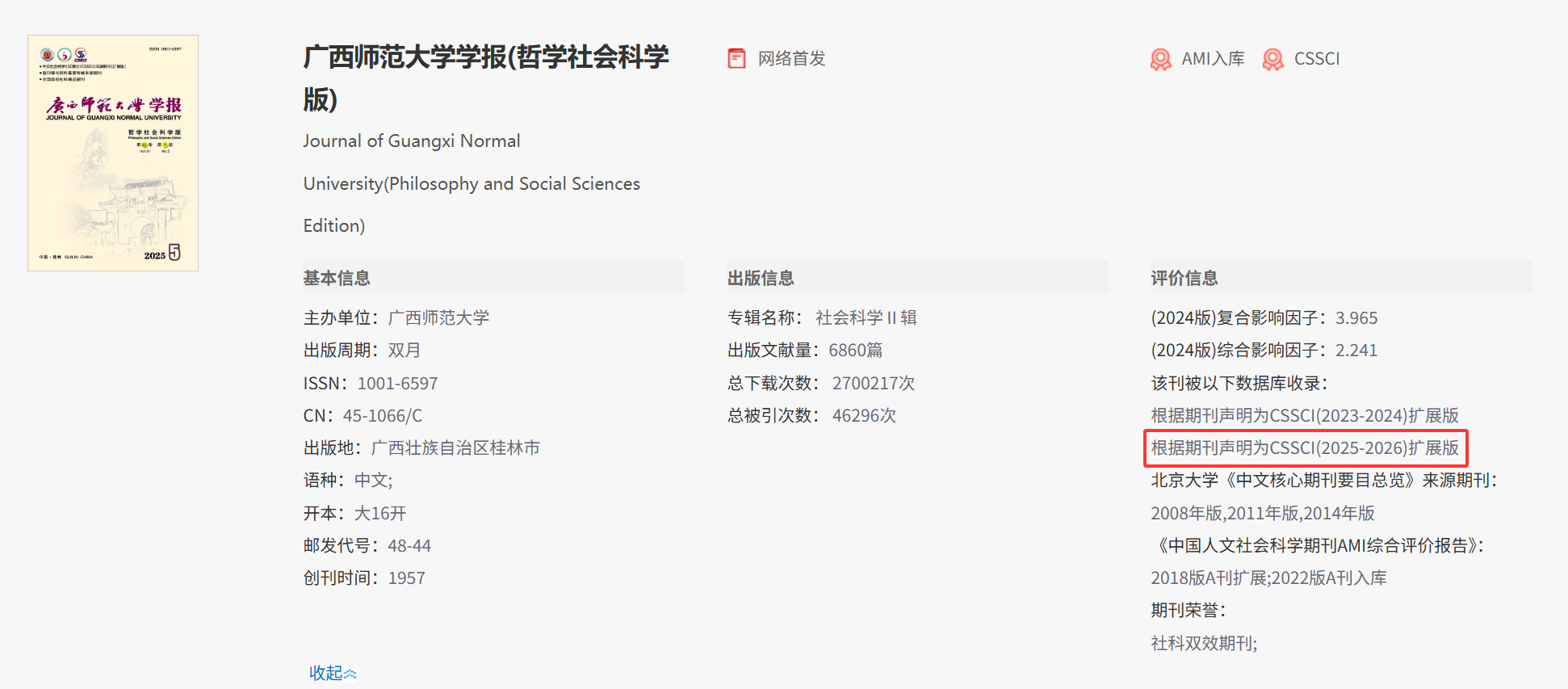 我的点评:根据知网页面的标注,广西师范大学学报(哲学社会科学版)又入选CSSCI扩展版(2025-2026)了
