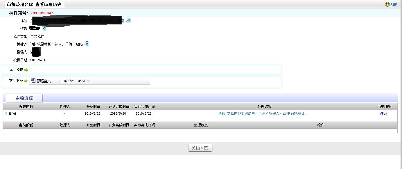 我的点评:速度快的惊人。5月26在线投稿,5月28日退稿,同时发送了退稿的邮件。虽然被退稿,但是速度确实值得称赞。