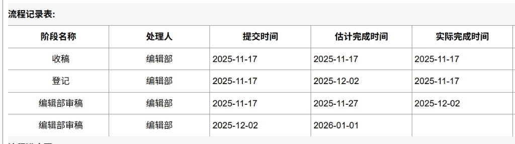 我的点评:六月初投稿。第一次编辑部审稿停止在6.19,没显示后续程序。根据其他学友的评论来看,应该算退稿了,就一直没管。今天偶然上网站看了一眼,竟然在八月初开始第二次编辑部审稿,前后一共四次,前几天进入外审。希望顺利