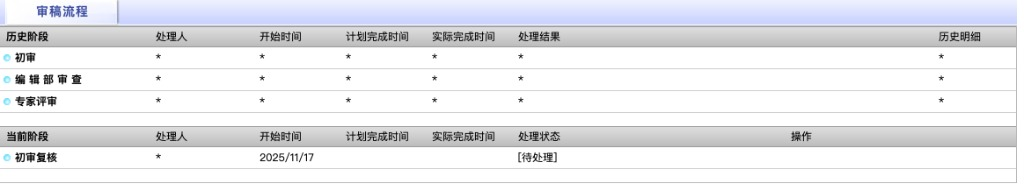 求问楼主,专家审稿结束并进入编辑部处理阶段时,专家审稿那一栏全部都是星号吗?我的全部都是星号,没有任何有效信息显示。