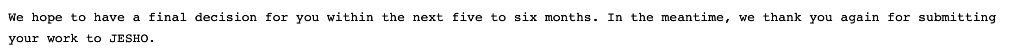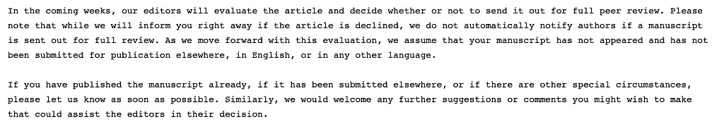 我的点评:投稿后收到自动回复,邮件说:如果拒稿会在几周内收到明确回复;过了初审的话,不会有任何进度说明,可能会有五到六个月的审核周期。如果学友需要投稿可以参考一下这个时间范围。我觉得时间太长,今天写了撤稿申请,不知道情况会怎样。mark一下。