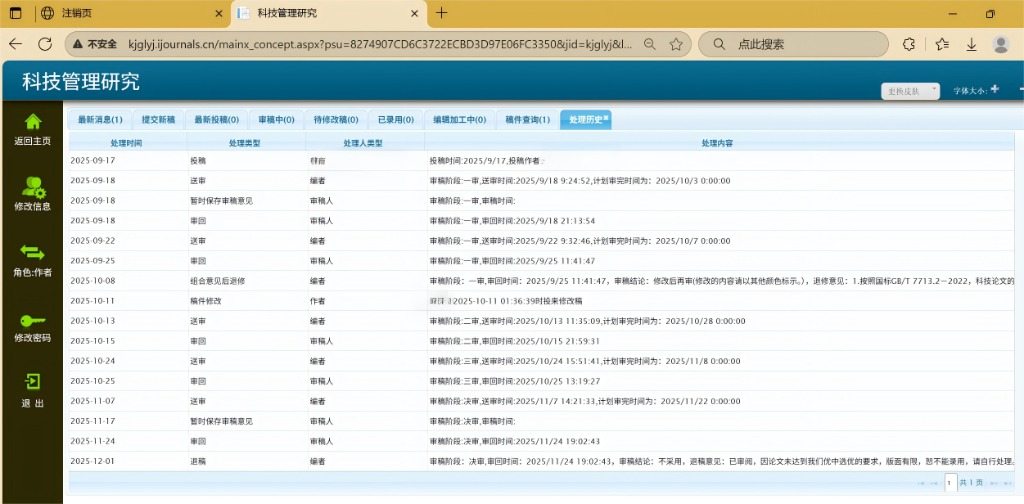 我的点评:算是对博士在读生比较友好的期刊了,至少没有因为博士生独作就直接拒稿。审稿过程很透明,编辑有在认真审稿,也给与了一些有助于提升论文质量的建议。编辑部的电话11月初是能打通的,后面就再打不通了,估计后面来稿量太大吧,连投稿网站都不容易刷开。根据那次沟通,个人推测一审应该只是主题跟格式,二审三审是送外审,决审是编辑团比稿。虽然最终还是被拒稿了,但还是有被鼓励到,至少过了一次外审,说明质量不算太差。本来没有博导挂前的论文竞争力就很弱,也没有很好的项目加持,能走到决审已经很欣慰了(