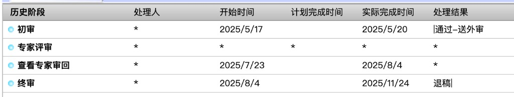 似乎该刊物的套路有变化。以前的情况是稿件若未过外审,在查看审回阶段就会被退稿。今年好像不少人在终审阶段被退稿