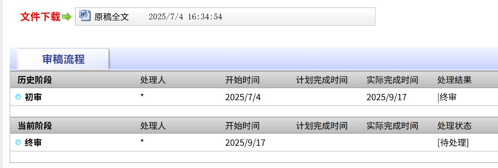 250704网站投稿,250917收到邮件告知通过初审且送外审,251011收到外审意见为修改后发表,251013提交修改稿,260109收到校样为261待刊,260208邮件收集稿酬信息,260209知网可查,260212收到样刊。