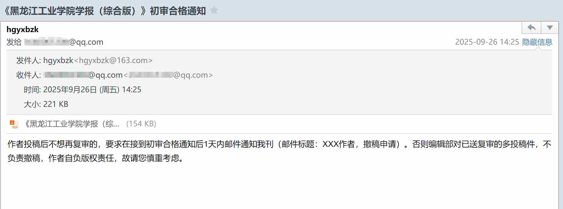 我的点评:2025-08-28投稿,9月25号收到邮件问是否有基金项目,添加了基金项目后,收到初审通过通知,没两天就收到了拒稿通知。