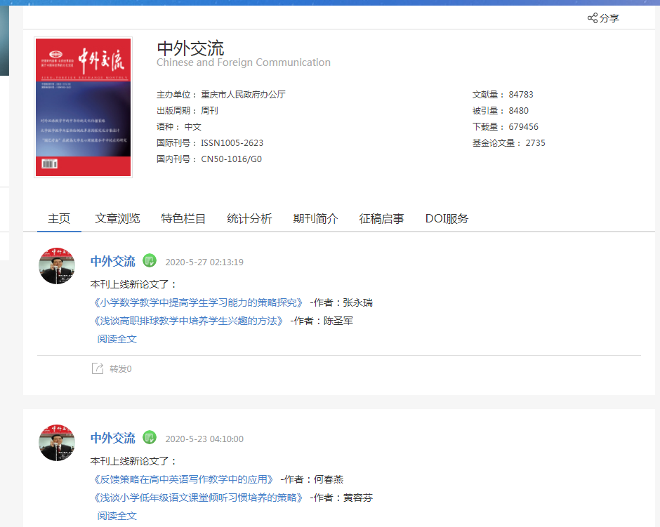 我的点评:《中外交流》杂志在万方可以检索2019年的文章。2020年的文章无法检索。但该账号在2020年仍有动态,虽然上传的论文都是2019年的文章。麻烦管理员核实确认该期刊是否停刊?谢谢!