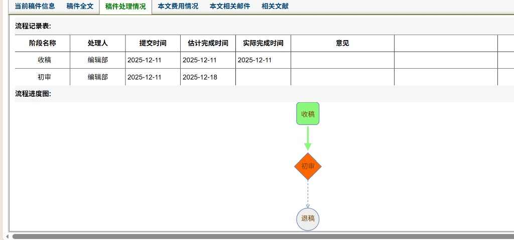 我的点评:第一次见到这种流程图,意思是初审完只有退稿一个选项?看着就闹心!不知道那些发出来的朋友,你们的流程图是什么样?目前还在初审,不抱希望的等待中……