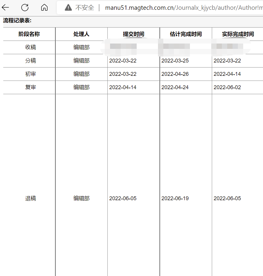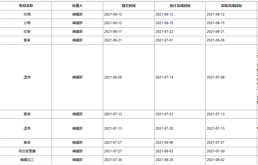 我的点评:投稿可查看审稿流程,投稿后收稿、分稿、初审约十天,复审两个月,比原定时间晚了一个多月,期间两次通知作者修改稿件,修改后又复审两月,复审结束后并未通知结果,打电话询问后几分钟内直接退稿,且退稿意见敷衍潦草。前后历时半年,审稿效率较低。