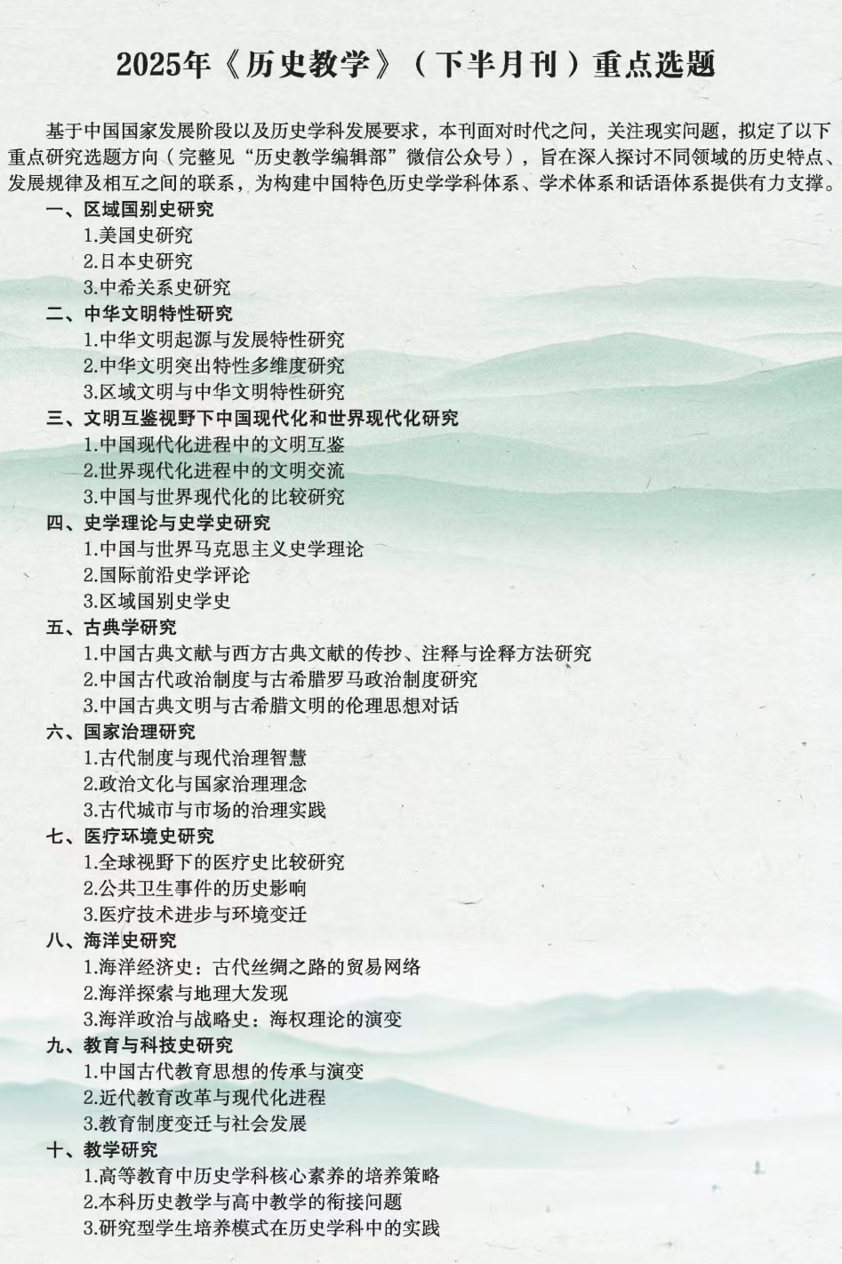 基于中国国家发展阶段以及历史学科发展要求,本刊面对时代之问,关注现实问题,拟定了以下重点研究选题方向(完整见“历史教学编辑部”微信公众号),旨在深入探讨不同领域的历史特点、发展规律及相互之间的联系,为构建中国特色历史学学科体系、学术体系和话语体系提供有力支撑。