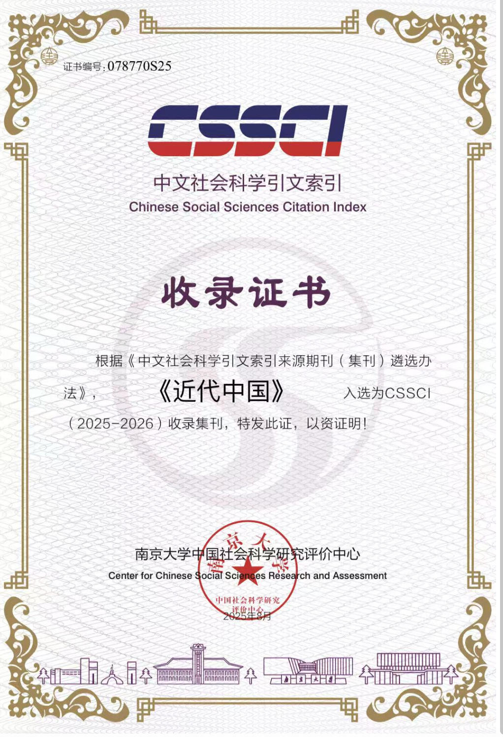 《近代中国》的CSSCI(2025-2026)版收录证明