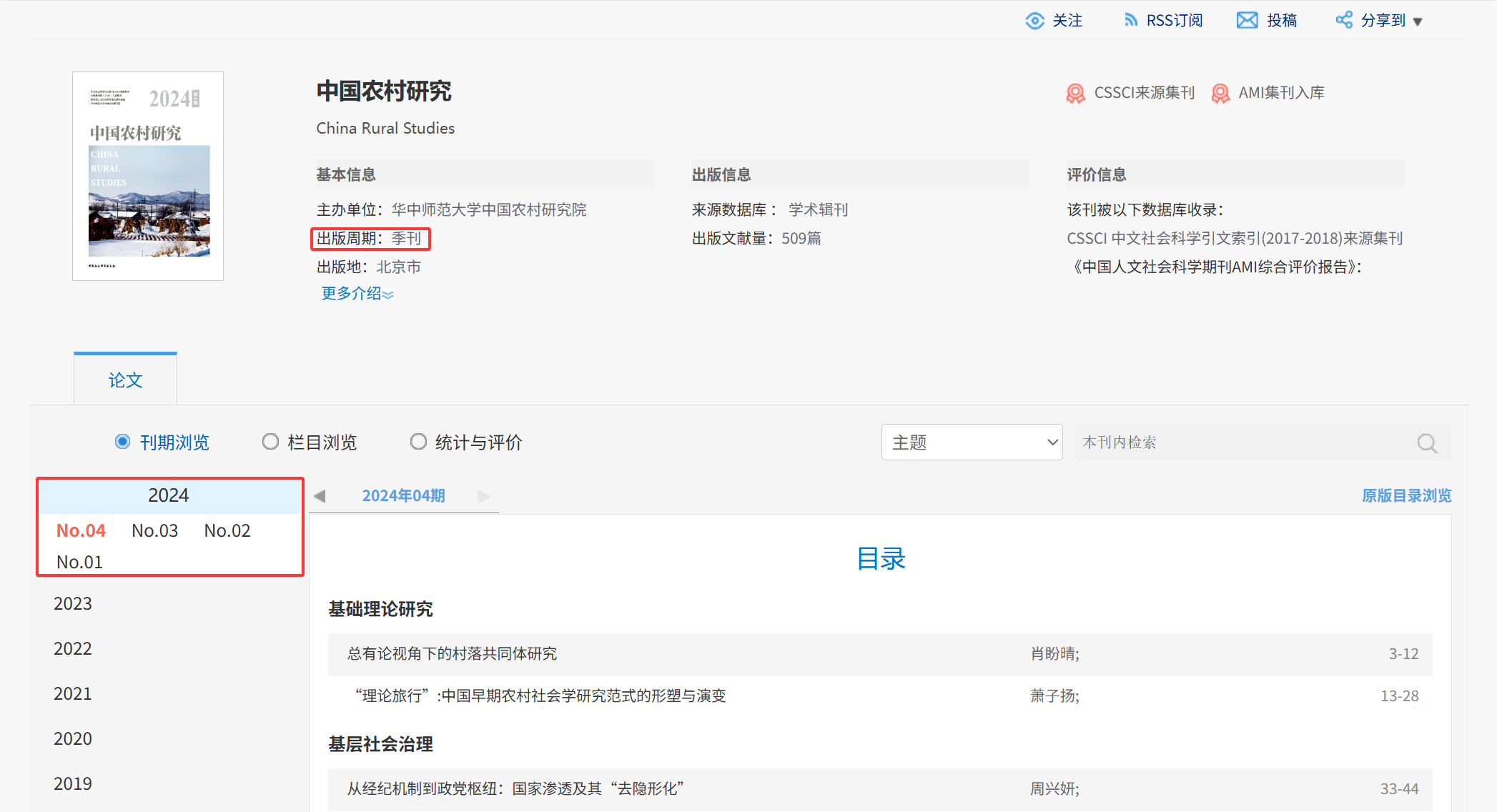 管理员老师你好,根据中国知网的标注以及刊出情况,《中国农村研究》已经从半年刊改为季刊。