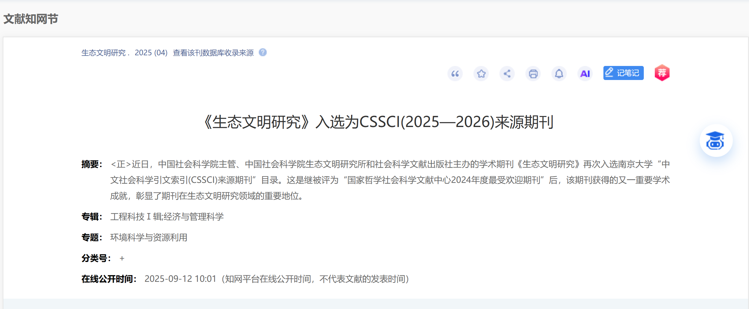 《生态文明研究》入选为CSSCI(2025—2026)来源期刊