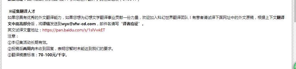 2.根据该刊最新2017年的征稿启事,多处规定变更,仅举1个例子,翻译文章的稿酬,已经提升到了70-100元每千字,而不是万维网现在介绍的60-70元每千字啦(有截图为证)