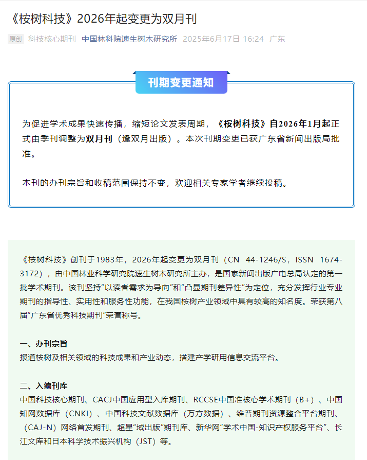 《桉树科技》自2026年1月起正式由季刊调整为双月刊(逢双月出版)。