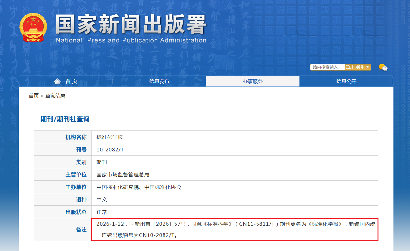 2026-1-22,国新出审〔2026〕57号,同意《标准科学》(CN11-5811/T)期刊更名为《标准化学报》,新编国内统一连续出版物号为CN10-2082/T。