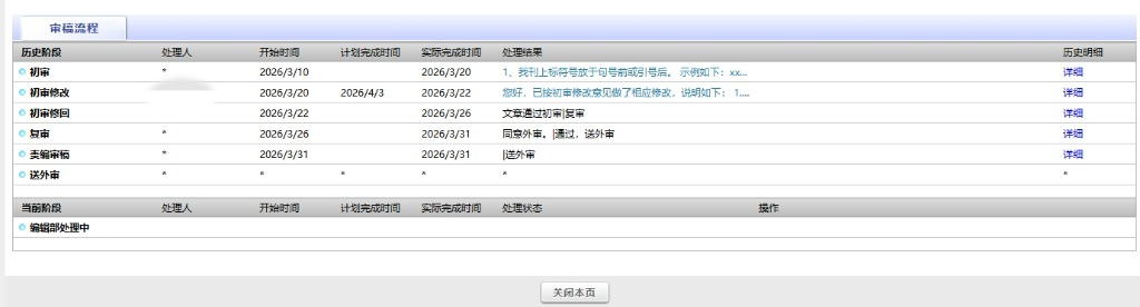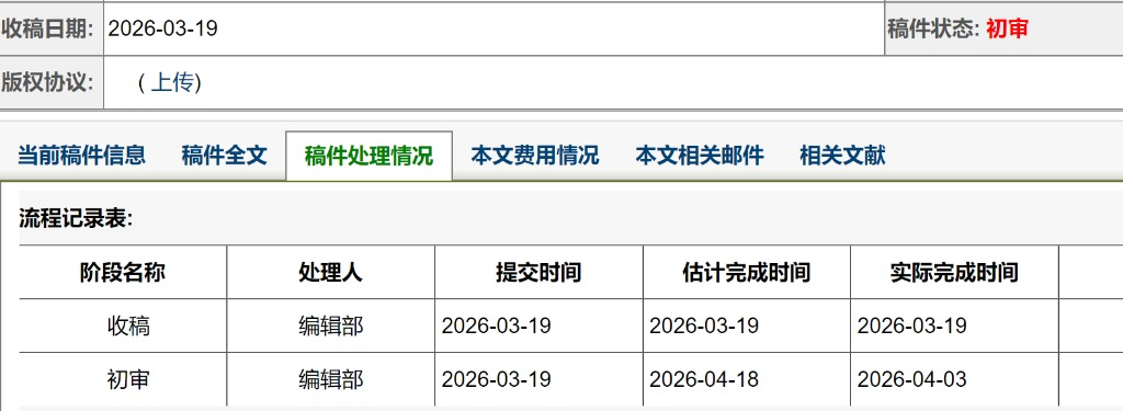我的点评:20260310投稿,0320初审修改,0322初审修回,0326复审,0331同意外审,送外审,0403编辑部处理中,也不知道最后结果是啥