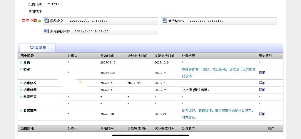 我的点评:四个月外审退稿。确实如楼下各位所说,这个刊的神人外审专家非常抽象。从批改的痕迹来看,只看了第一段和最后一段,而且只会挑病句,最后给个退稿。而且他挑的“欠准确”的病句,我一个汉语言本科出身的人都觉得没问题,不知道他是怎么认为那是病句的。怀疑是不是他们大专里面直接找了个在读学生改的。