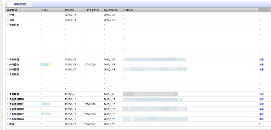 我的点评:这么优秀的期刊没人点评吗,那我先来。可能是编辑老师对主题比较感兴趣,投完以后打电话让发原稿给他(估计是方便发外审),一审返修只给了一周左右的时间,外审老师意见很深入,结果修改从12000字增加到17000字,本来编辑老师想让后续精简字数,后来也没收到减少字数的通知。后续的返修主要是格式之类的。点赞。