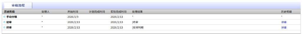 我的点评:总结一下个人最近投稿该刊的经验,以供学友参考:2025年12月1日投稿,12月3日完成收稿审查,12月4日送初审,12月6日初审通过送复审,于12月27日送审终审,1月15日录用。起初无意见, 主动发邮件询问,值班编辑随即回复,从而得以进一步打磨小文,由衷感激,值得推荐