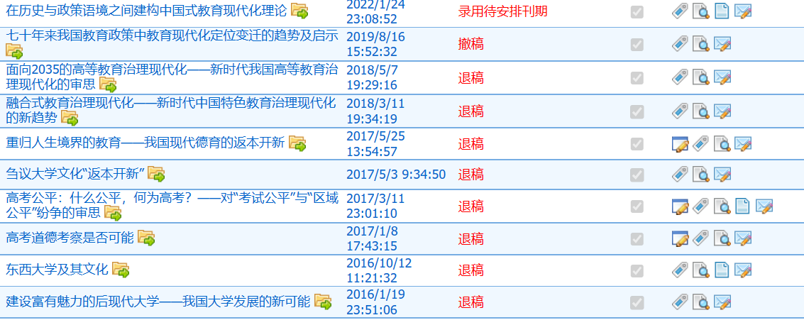 我的点评:十一月中旬投稿,10天“正在初审”,15天“正在复审”,10天“等待责编处理”,6天“正在外审”,今天收到返修意见,状态为“退改”,有幸经历后续流程的话再来追评。