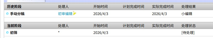 我的点评:4.3投稿,当天手动分稿阶段结束,窗口显示处理人“初审编辑”,处理结果“小编辑”,点开详情查看,有个下拉菜单,显示有四个编辑,第一个是“小编辑”。这是要退稿吗?还是编辑老师自己幽默了自己?