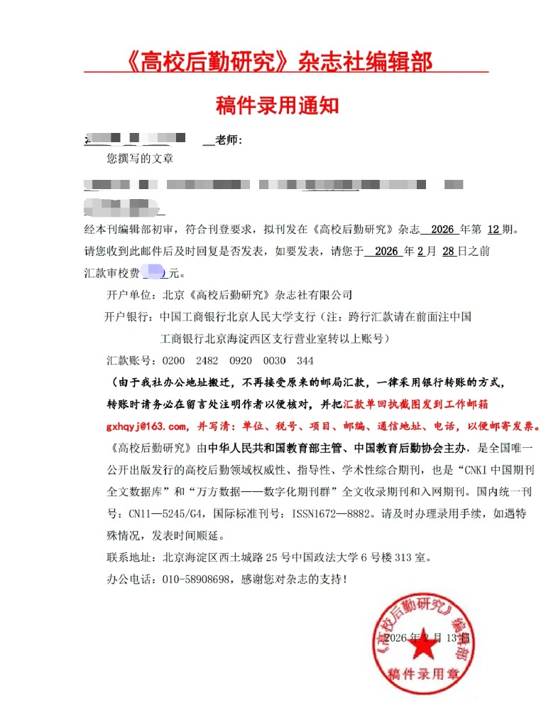 我的点评:投稿审核很快,当天就给了期刊投稿格式,调整格式后,不到1个月收到了录用通知,要缴费800元并重新调整文章词句。每次投稿邮箱都有回复,整个投稿过程比较好。总体来说,期刊审稿效率非常高,只要文章质量不差且主题相关,都比较好录用的。