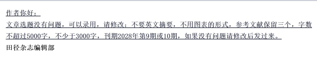 我的点评:10月31号投,12月3号回复可以录用,28年第九期或第十期,除了时间有点长,不能有图片两个小问题之外,还是可以的毕竟体育类期刊2个月以内回复,邮箱投稿,还能有影响因子的,不多。最后,今天才把修改稿和查重报告发过去,目前还没给我录稿通知,版面费多少还不确定,将持续跟进,that's it!