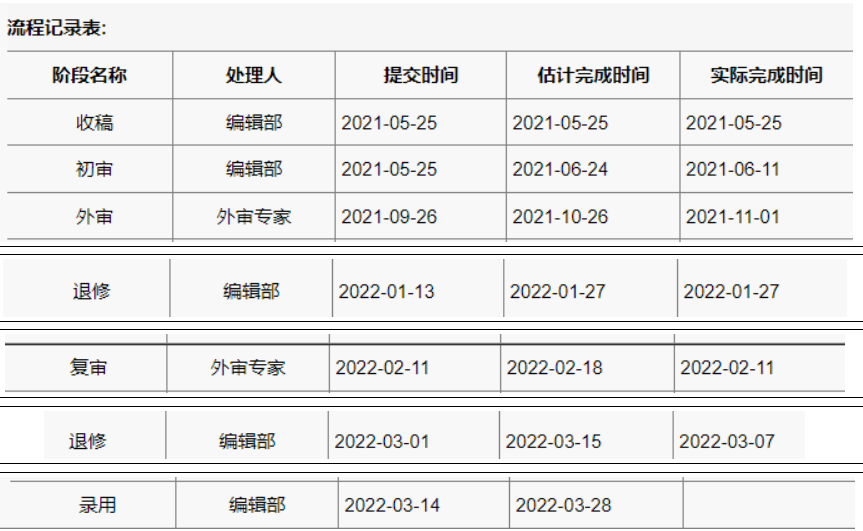 我的点评:处理流程和投稿时间如图所示。感觉外审完成后编辑部处理速度较慢,导致审稿周期长,不过在这个水平的中文期刊中仍算中规中矩。相较于之前,该期刊的审稿费从50涨到了100,第一外审环节变为了编委初审(这个环节没有正式出现在处理流程图中)。另外,之前一篇被该期刊录用的文章并没有网络首发,而是等了很久正式出版。但是现在稿件录用后编辑部会发邮件询问作者是否同意网络首发,同意之后几天内就能在知网查到,这一点非常友好。