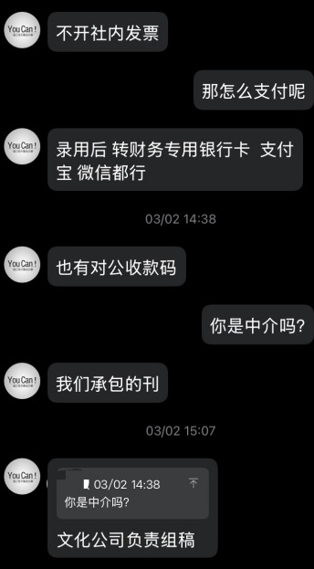 我找的他!录用了!后来说了半天他给开社内发票了!发票拿到了!开发票不给400稿费!不开发票给400稿费!录用后还要改要根据修改意见改!感觉是社内编辑!也感觉是中介!总结下可能是编辑自己出来收稿子!他肯定能搞到很低的价格!他赚点外快!