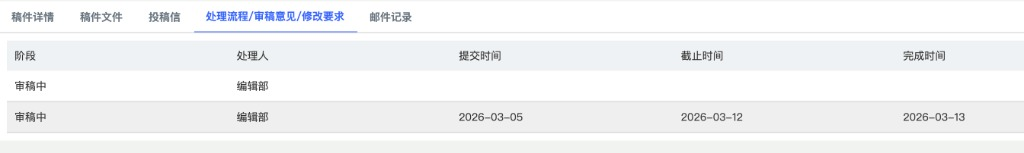 系统:在投稿中,除退修状态外,其他时间均显示“审稿中”,无法查看具体进度。