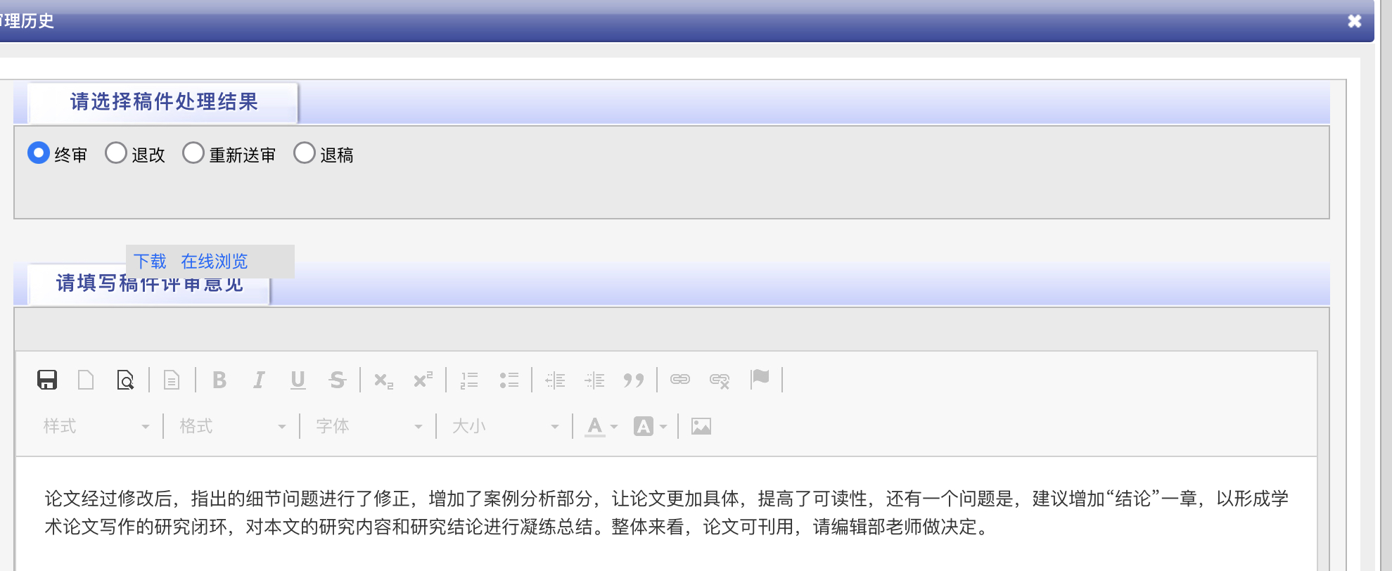 我的点评:1.1系统投稿,当天就初审送外审,此后一直显示编辑部处理中,过了差不多两周时间,直到昨天外审审回后,下午便显示退稿,同时有邮件通知,登录系统查看可以看到外审意见,第一二条意见主要内容揪着中央政策和讲话精神细节侃侃而谈,但具体却很少涉及正文内容,更无技术性修改意见。似乎只草草看了摘要和研究背景部分,牛头不对马嘴。第三条意见则是说论文整体篇幅过长,更是无语。总之,还是感谢编辑部的高效率,全程也并未耗费过长时间,只是无奈外审遇人不淑。
