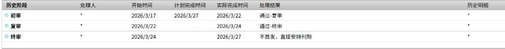 我的点评:初审预计12月4日完成,怎么还在处理中啊