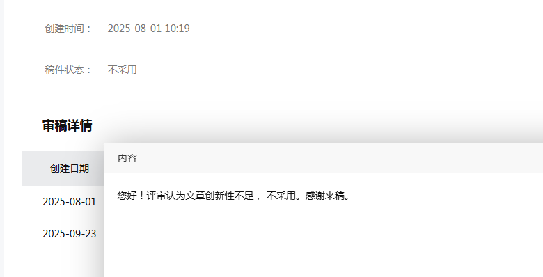 我的点评:等了两个月,期间一点消息都没有,一直显示外审中,然后拒稿,没有修改意见,直接就是文章创新性不足。
