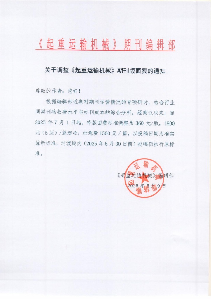 根据编辑部近期对期刊运营情况的专项研讨,结合行业同类刊物收费水平与办刊成本的综合分析,经商议决定:自2025年7月1日起,将版面费标准调整为360元/版,1800元(5版)/篇起收;加急费1500元/篇。以投稿日期为准实施新标准,过渡期内(2025年6月30日前)投稿仍执行原标准。